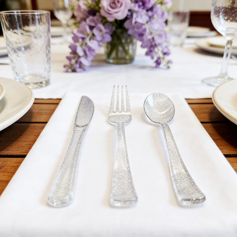 Sammenlignet med almindeligt engangsservice og traditionelt metalservice, skiller Classic Party Knives Forks Spoons Plastic Bestik sig ud med hensyn til tekstur. Produktoverfladen har gennemgået en særlig behandling, hvilket har opnået en glans, der kan sammenlignes med metal. De metallic-farvede modeller udstråler en raffineret og elegant atmosfære, mens de transparente modeller er rene og gennemsigtige og bryder fuldstændig det billige indtryk af engangsservice. Med hensyn til design har servicet glatte og regelmæssige linjer, der perfekt integrerer skønhed og praktisk.